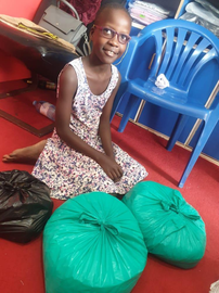 Links: Namatovu Jeydrus (5 Klasse, Makindye Junior School) mit der erhaltenen Nahrung. Vor kurzem hatte sie Augenprobleme. Wir unterstützen die Familie bei dem Erwerb von Brillengläser