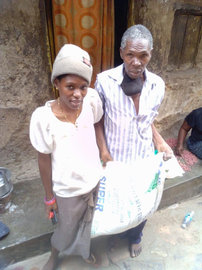 Rechts: Nakawuuki Mwajibu (2 Jahr Bachelor in Business Administration an der Ndejje Universität) mit ihrem Vater und dem erhaltenen Sack Bohnen.